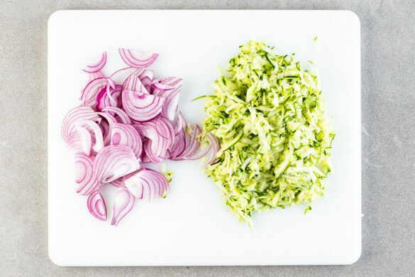 Die Zwiebeln schälen, halbieren und in sehr feine Streifen schneiden. Die Zucchini mit einer Küchenreibe grob raspeln und anschließend mit den Händen möglichst viel Flüssigkeit auspressen.