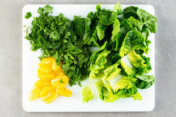 Den Romanasalat in mundgerechte Stücke schneiden, den Strunk entfernen. Die Orangen mit einem Messer schälen, dabei auch die weiße Haut entfernen. Das Fruchtfleisch in Spalten schneiden. Den Koriander samt Stängeln grob schneiden. Die Minzeblätter abzupfen und ebenfalls grob schneiden.
