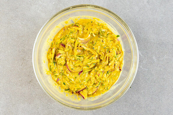 Die Maisstärke mit 75g Mehl, der Garam-Masala-Gewürzmischung, 1TL Salz und 1 kräftigen Prise Pfeffer vermengen. 250g Wasser zugeben und alles mit einem Schneebesen zu einem glatten Teig verrühren, dann die Zwiebeln und die Zucchini untermengen.