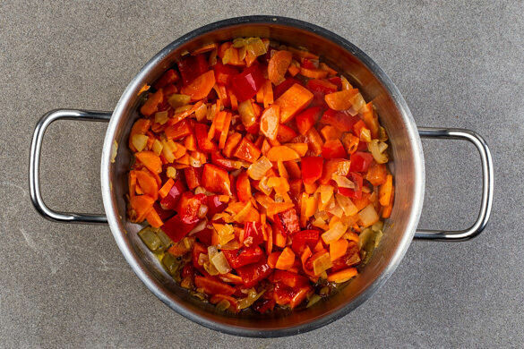 Die Karotten ggf. schälen, längs halbieren und quer in dünne Scheiben schneiden. Die Paprika vierteln, entkernen und in 1–2cm große Stücke schneiden. Die Karotten und die Paprika in den Topf zu den Zwiebeln geben und 5–6Min. mitbraten.