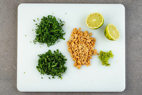 Die Petersilie und den Koriander samt Stängeln fein schneiden. Die Erdnüsse grob hacken. Die Limettenschalen fein abreiben, dann die Limetten halbieren.