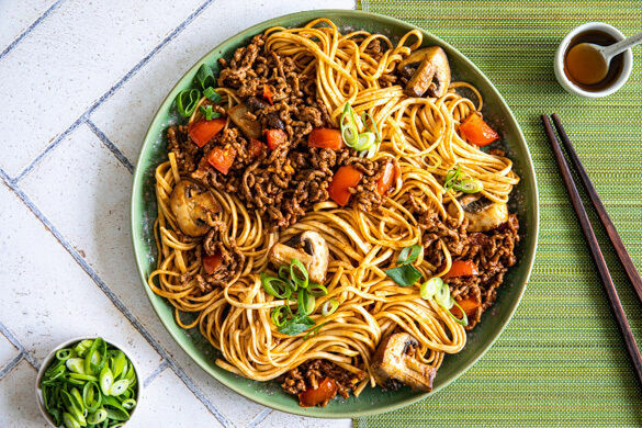 Die Udon-Nudeln mit der Hackfleisch-Pilz-Pfanne auf Teller verteilen und mit den Lauchzwiebeln garniert servieren.