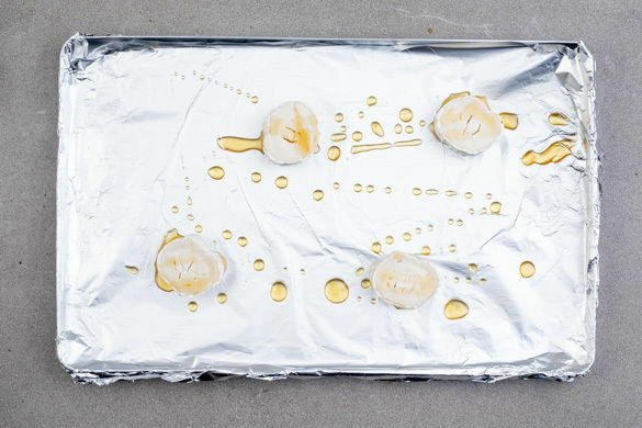 Den Käse in insgesamt 8 Scheiben schneiden. Das Backblech mit Alufolie auslegen, diese dünn mit 2TL Olivenöl beträufeln und die Käsescheiben darauflegen. 1EL Honig über den Käse träufeln und den Käse 3–5Min. grillen bzw. backen, bis der Honig karamellisiert und der Käse appetitlich gebräunt ist.
