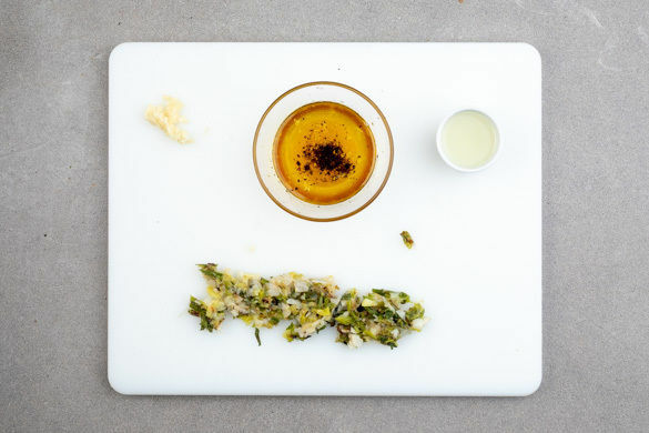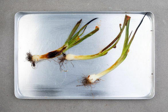 Die Lauchzwiebeln mit 2TL Olivenöl einreiben und auf ein Backblech geben. Im Ofen 4–6Min. grillen bzw. backen, bis die Lauchzwiebeln weich und sehr dunkel sind. Nach der Hälfte der Zeit einmal wenden. Nach dem Grillen/Backen vom Blech nehmen und auskühlen lassen.