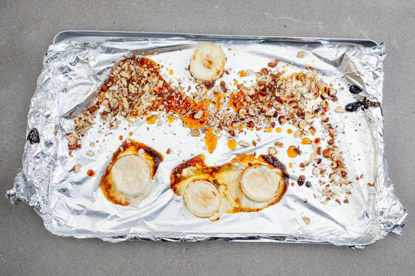 Den Käse in 4 Scheiben schneiden. Das Backblech mit Alufolie auslegen, diese dünn mit 1TL Olivenöl beträufeln und die Käsescheiben darauflegen. 1TL Honig über den Käse träufeln und den Käse 3–5Min. grillen bzw. backen, bis der Honig karamellisiert und der Käse appetitlich gebräunt ist.