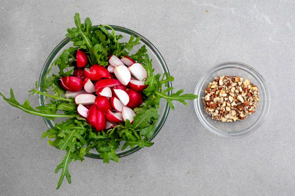 Die Radieschen je nach Größe halbieren oder vierteln und mit dem Rucola in eine Schüssel geben. Mit dem restlichen Limettensaft und 1TL Olivenöl vermengen. Die Haselnüsse grob hacken.