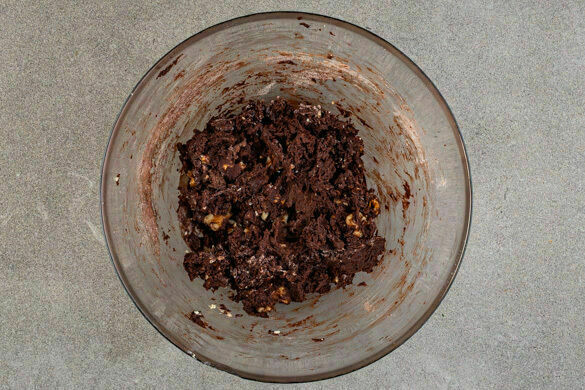 Das Mehl, 1TL Backpulver, das Kakaopulver und die Walnüsse unter die vorbereite Masse heben und mit dem Handrührgerät ca. 30Sek. vermengen.