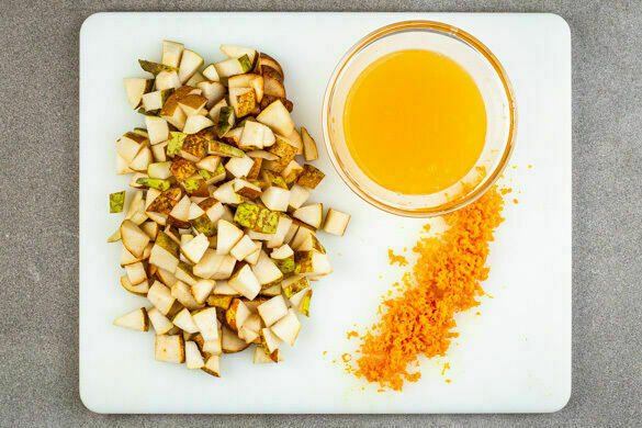 Die Birnen ggf. schälen und in ca. 1cm große Würfel schneiden. Die Schale einer Orange abreiben, dann alle Orangen halbieren und auspressen.