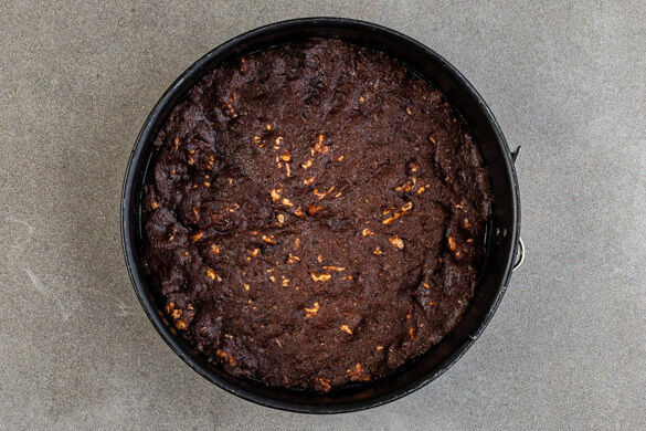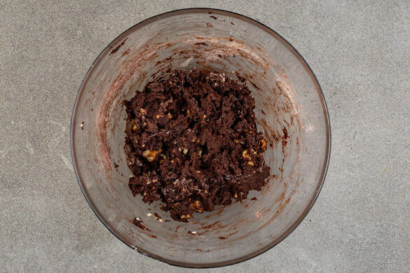 75g Mehl, ½TL Backpulver, das Kakaopulver und die Walnüsse unter die vorbereite Masse heben und mit dem Handrührgerät ca. 30Sek. vermengen.