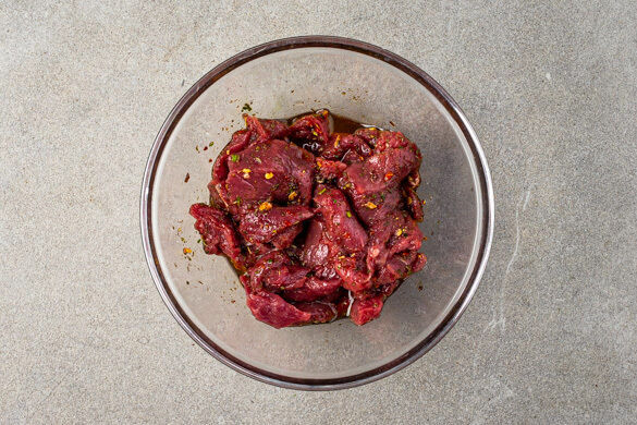 In einem mittelgroßen Topf ausreichend gesalzenes Wasser für die Pasta zum Kochen bringen. Das Fleisch trocken tupfen, mit 1EL Olivenöl und ½–1TL Gewürzmischung einreiben und beiseitestellen.