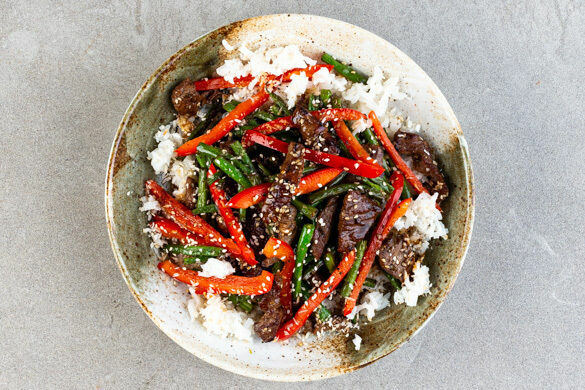 Mmmh ... ein Gedicht! Der duftende Jasminreis wird mit Kokosraspeln verfeinert, bevor du ihn zur schnellen Rindfleischpfanne mit grünen Bohnen und Sesam servierst. Die knackigen Paprikastreifen werden mit Limette verfeinert und sind herrlich erfrischend. Guten Appetit!