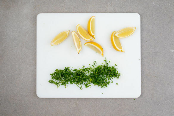 Die Petersilie samt Stängeln fein hacken. Die Zitrone in Spalten schneiden.