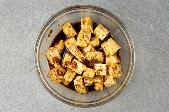 Den Tofu trocken tupfen und in ca. 2cm große Würfel schneiden. Die Sojasauce mit 1EL Limettensaft, der ½ des Knoblauchs, der ½ des Ingwers und 1TL (braunem) Zucker zu einer Würzsauce verrühren. Den Tofu in der Würzsauce wenden, dann herausnehmen und trocken tupfen.