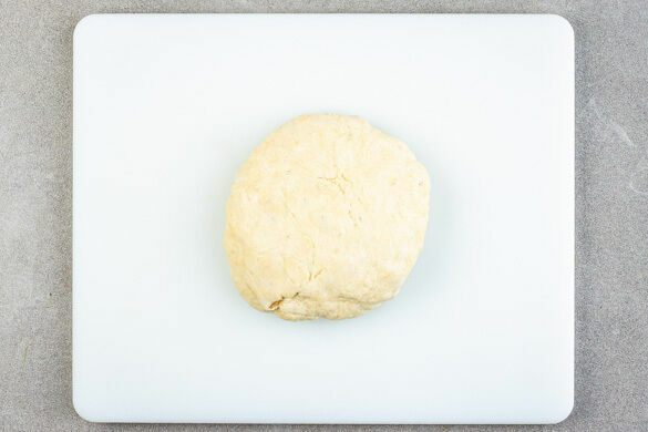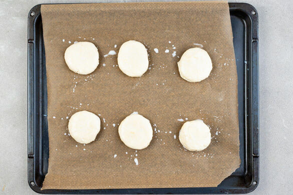 40g kalte Butter in ca. 1cm große Würfel schneiden, mit 225g Mehl, 1TL Backpulver, 2EL Zucker und 1 Prise Salz mischen. Mit den Händen zu einer krümeligen Masse verarbeiten, dann 130ml Buttermilch zugeben und untermischen. Eine Arbeitsfläche mit Mehl bestäuben, den Teig darauf vorsichtig und nicht zu lange kneten.