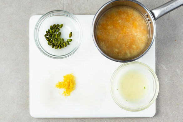 Den Backofen auf 220°C (200°C Umluft) vorheizen. Die Zitronenschale abreiben und die Zitrone auspressen. Den Ingwer schälen und fein reiben. Die Pistazien in einem kleinen Topf ohne Fett 1–2Min. anrösten, anschließend beiseitestellen. Die Cranberrys, 1–2EL Ingwer, 2TL Vanillezucker und 200ml Wasser in dem Topf aufkochen und 16–19Min. bei niedriger Hitze köcheln lassen.