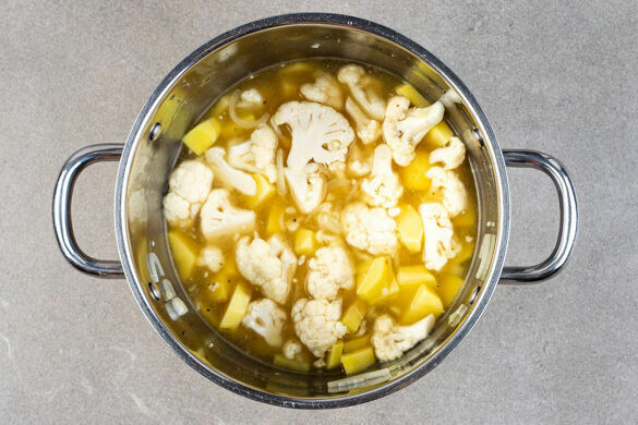 Die Zwiebeln und den Knoblauch in einem großen Topf mit 2EL Pflanzenöl bei mittlerer bis starker Hitze ca. 2Min. glasig anschwitzen. Die 1/2 des Blumenkohls mit je 1 kräftigen Prise Salz und Pfeffer hinzufügen und ca. 1Min. mitbraten.