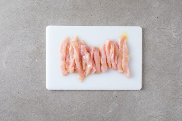 Das Hähnchenfleisch trocken tupfen, in ca. 3–5cm lange und 1–2cm breite Streifen schneiden und mit der Gewürzmischung sowie 1EL Olivenöl vermengen.