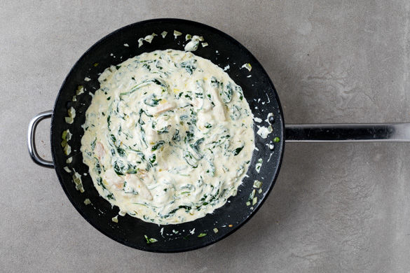 Das Hähnchen in einer großen Pfanne mit 1EL Olivenöl bei mittlerer Hitze 3–5Min. goldbraun anbraten. Die Zwiebeln hinzugeben und 1–3Min. glasig braten. Mit 150ml Wasser ablöschen, den Brühwürfel hineinbröseln und die Sauce kurz aufkochen lassen. Dann den Babyspinat unterrühren und zusammenfallen lassen.