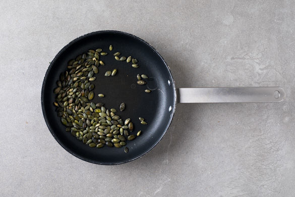 Die Pfanne erneut auf mittlerer Stufe erhitzen und die Kürbiskerne darin ohne Fett 3–5Min. goldbraun rösten. Vorsicht: Die Kürbiskerne können schnell verbrennen! Die Kürbiskerne aus der Pfanne nehmen und mit 1EL Olivenöl und 1 Prise Salz vermischen.