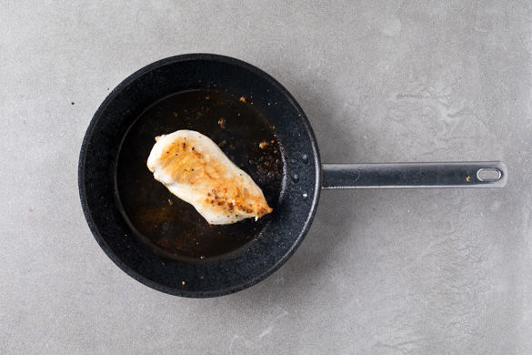 Das Hähnchen trocken tupfen, mit ca. 1EL Öl einreiben und mit Salz und Pfeffer würzen. In einer großen Pfanne bei mittlerer Hitze 2–3Min. von beiden Seiten goldbraun anbraten. Das Fleisch im Ofen auf einem mit Backpapier belegten Backblech in 10–12Min. fertig garen. Es soll auch in der Mitte durchgegart sein. Die Pfanne auswischen.