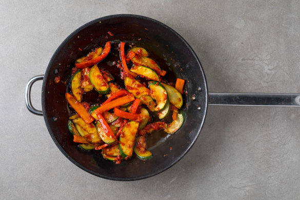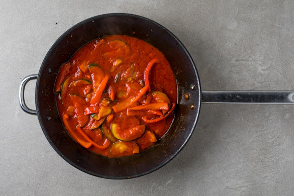 Die Zucchini und die Paprika in einer großen Pfanne mit 1–2EL Olivenöl bei mittlerer Hitze 3–5Min anbraten. Den Knoblauch und ca. 3/4 des Tomatenmarks hinzugeben und unterrühren.