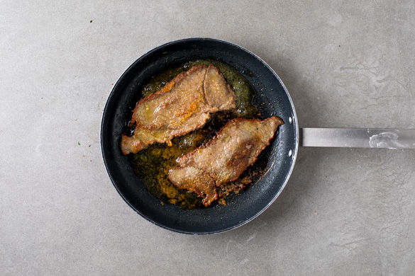 Die Kalbsschnitzel trocken tupfen, von beiden Seiten mit Salz und Pfeffer würzen und in etwas Mehl wenden. Überschüssiges Mehl leicht abklopfen. Die Schnitzel in einer großen Pfanne mit 1–2EL Olivenöl bei mittlerer Hitze von jeder Seite 2–3Min. anbraten. Die Garzeit kann je nach Dicke der Schnitzel variieren.