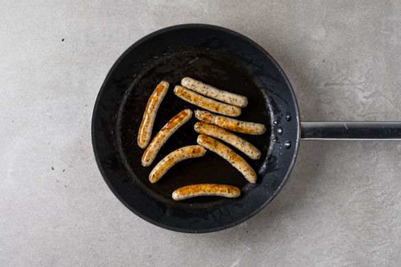 Die Würstchen in einer großen Pfanne mit 1EL Pflanzenöl in 4–5Min. bei mittlerer Hitze knusprig anbraten. Aus der Pfanne nehmen. Ca. 1/3 der Butter in die Pfanne geben und schmelzen, dann 1EL Mehl hineinrühren, mit 200ml Wasser ablöschen und den Brühwürfel hineinbröseln. Die Sauce 2–3Min. leicht einköcheln lassen. Den Thymian unterrühren.