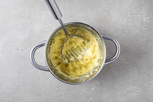 Die Kartoffeln abgießen und mit der 1/2 der Milch und 1/2 der restlichen Butter mithilfe eines Kartoffelstampfers zu einem Püree stampfen. Mit Salz abschmecken. Tipp: Wer das Püree cremiger mag, kann die gesamte Milch verwenden.