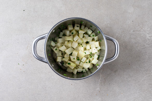 Die Kartoffeln in das kochende Wasser geben und darin 10–15Min. leicht köcheln lassen, bis sie weich sind.