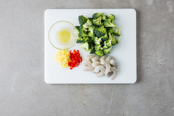 Den Brokkoli in 1,5–2cm große Röschen schneiden. Den Ingwer schälen und fein würfeln. Tipp: Der Ingwer lässt sich am besten mit einem kleinen Löffel schälen. Die Peperoni entkernen und in feine Halbringe schneiden. Die Limettenschale abreiben, dann die Limette halbieren und auspressen. Die Garnelen trocken tupfen und mit Salz und Pfeffer würzen.