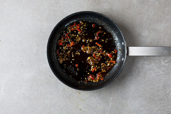 In einem mittelgroßen Topf 1L Wasser zum Kochen bringen. Die Sojasauce, die Fischsauce, 1–2TL Limettensaft und 2–3TL Wasser zum Karamell in die Pfanne geben, den Ingwer und die Peperoni hinzufügen, alles gut verrühren und 1–2Min. köcheln lassen.