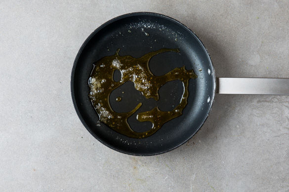 In einer großen Pfanne 2EL Zucker und 2–3EL Wasser bei mittlerer Stufe erhitzen. Die Pfanne schwenken, um den Zucker aufzulösen. Weitere 2–3Min. erhitzen, bis die Zuckermischung eine goldene Farbe annimmt. Den Karamell immer im Auge behalten und darauf achten, dass er nicht verbrennt.