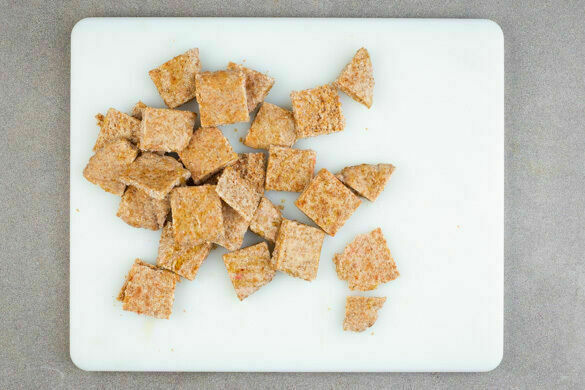 Die Pitabrote in 2–3cm große Stücke schneiden.