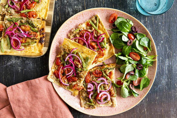 Den Thunfisch-Bohnen-Mix gleichmäßig auf dem Teig verteilen. Den Flammkuchen 9–12Min. im Ofen backen, bis der Teig knusprig und an den Rändern goldbraun ist.