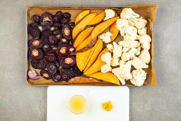 Den Backofen auf 240°C (220°C Umluft) vorheizen. Den Blumenkohl in mundgerechte Röschen zerkleinern. Die Süßkartoffeln ggf. schälen und in ca. 1cm breite Spalten schneiden. Die Karotten ggf. schälen und schräg in dünne Scheiben schneiden.