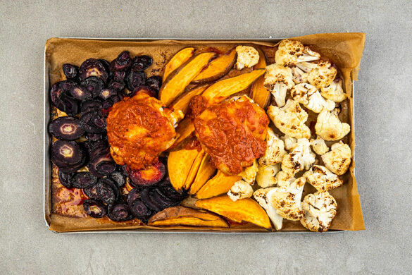 Chili-Fans aufgepasst! Unter der Losung „Peri-Peri“ könnt ihr heute hemmungslos eurer Schärfelust frönen und die Hähnchenoberkeulen mit einer feurigen Mischung aus Cajun-Gewürzen und Harissapaste bestreichen, bevor sie in den Ofen wandern. Zur Abkühlung gibt es milden gebackenen Blumenkohl, Süßkartoffelspalten und einen zitronigen Knoblauchjoghurt. Ihr habt es Euch verdient!
