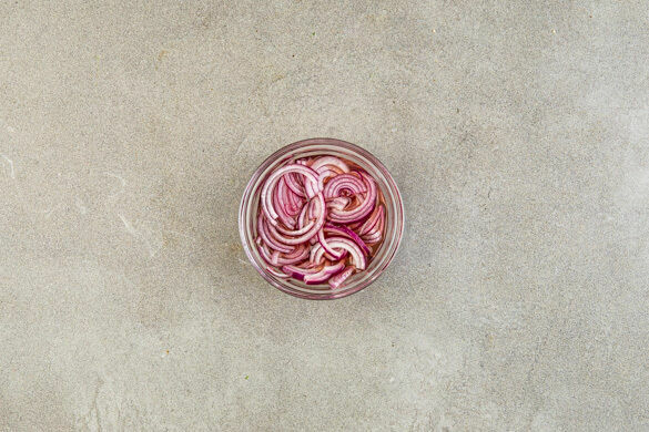 2EL Essig, 1EL Wasser, 1TL Honig und ½TL Salz gut verrühren. Die Zwiebel schälen, halbieren, in feine Streifen schneiden und mit dem Einlegesud vermengen.