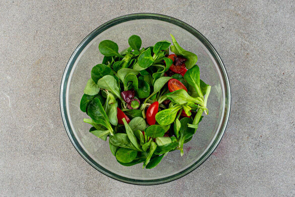 Die Oliven grob schneiden. Die restlichen Tomaten halbieren und mit dem Feldsalat und den Oliven vermengen.