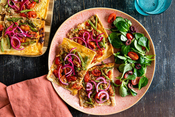 Heute feiern wir eine Traumhochzeit: Der aus dem Elsass stammende Flammkuchen wird mit dem berühmtesten Thunfisch-Topping der Côte d’Azur vermählt! Die Trauung wird farbenfroh mit grünen Bohnen und Kirschtomaten ausstaffiert, geheiratet wird auf knoblauchig-zitronigem Boden und die Gäste, ein feiner Feldsalat mit Oliven und eingelegte Zwiebelstreifen, sind einfach nur hingerissen von dem rauschenden Fest der Liebe. À la santé!
