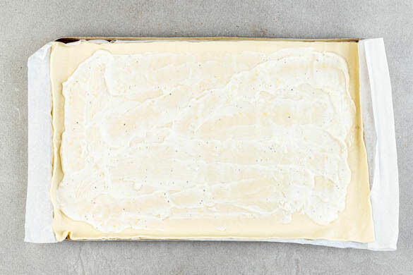 Den Teig mit dem Papier nach unten auf einem Backblech ausrollen. Die Zitronenschale abreiben, dann die Zitrone halbieren und auspressen. Den Knoblauch schälen und fein würfeln oder reiben. Die Zitronenschale, 1TL Zitronensaft und den Knoblauch mit 3EL Mayonnaise verrühren. Die Sauce mit Salz und Pfeffer abschmecken und den Teig damit bestreichen.
