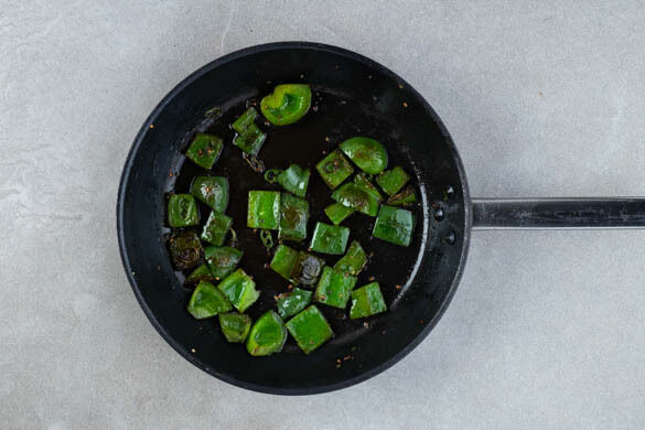 Die Paprika vierteln, entkernen und in grobe Stücke schneiden. Die Chilischote in dünne Ringe schneiden. Tipp: Für weniger Schärfe die Kerne entfernen. Die Paprika und die 1/2 der Chiliringe oder mehr nach Geschmack mit 1 Prise Salz in einer zweiten Pfanne mit 1EL Olivenöl bei mittlerer bis starker Hitze 4–5Min. braten, bis die Paprika leicht gebräunt ist.