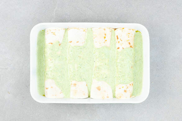4 Tortillas mit dem Hähnchen-Gemüse-Mix füllen, dabei möglichst wenig Flüssigkeit aus der Pfanne mitnehmen. Die Enchiladas vorsichtig mit den Nahtseiten nach unten in eine mittelgroße Auflaufform legen, mit der Paprikacreme begießen und auf der oberen Schiene im Ofen 5–8Min. grillen bzw. backen, bis die Creme leicht gebräunt ist und Blasen wirft.