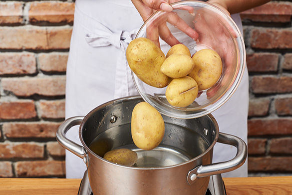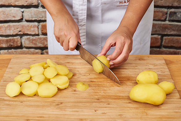 Die gegarten Kartoffeln in ein Sieb abgießen, unter kaltem Wasser kurz abkühlen, nach Wunsch schälen und in 0,5–1cm breite Scheiben schneiden.