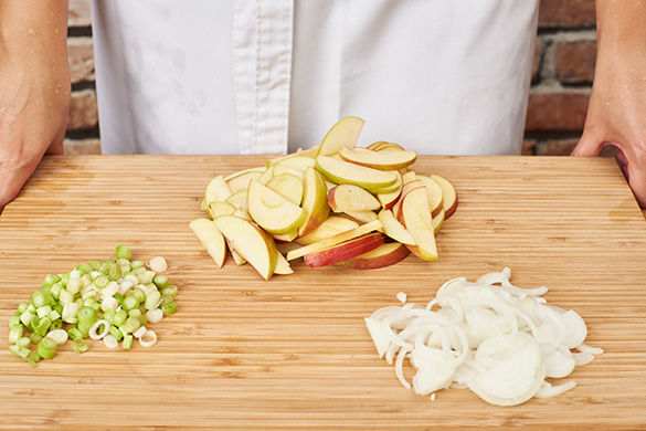 Die Lauchzwiebel in feine Ringe schneiden. Die Zwiebel schälen, halbieren und in dünne Halbringe schneiden. Den Apfel vierteln, entkernen und in längliche Spalten schneiden.