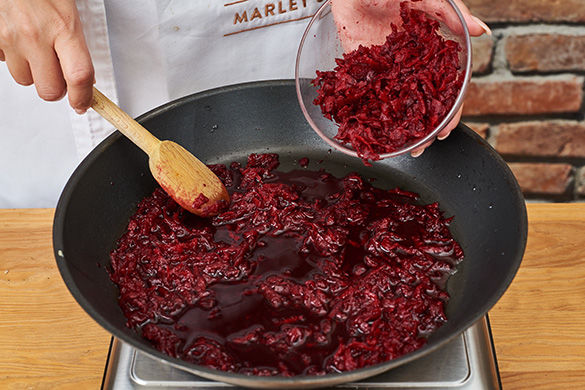 In einer großen Pfanne 50ml Wasser und 1EL Essig erhitzen und die geraspelte Bete darin 4–5Min. dünsten. Tipp: Wer keine rohen Zwiebeln mag, kann sie jetzt mitdünsten.