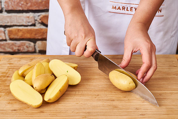 Einen mittelgroßen Topf mit ausreichend gesalzenem Wasser für die Kartoffeln zum Kochen bringen. Währenddessen die Kartoffeln waschen und mit der Schale längs halbieren. Dann 15–20Min. gar kochen, abgießen und abkühlen lassen.