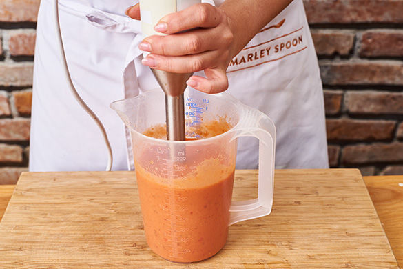 Die Tomaten mit 1TL gehackten Zwiebeln, dem Knoblauch, dem Ketchup, 2TL Gulaschgewürz und, je nach Geschmack, einer ganzen oder halben Chili in einem hohen, schmalen Gefäß mit dem Stabmixer pürieren. Die Salsa mit Olivenöl, Salz und Pfeffer abschmecken.