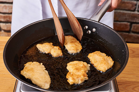 Eine große Pfanne ca. 1cm hoch mit Pflanzenöl befüllen und auf mittelhoher Stufe erhitzen. Dann die panierten Hähnchenstreifen darin 4–5Min. von allen Seiten knusprig braten. Anschließend auf Küchenkrepp abtropfen lassen und mit etwas Salz würzen.
