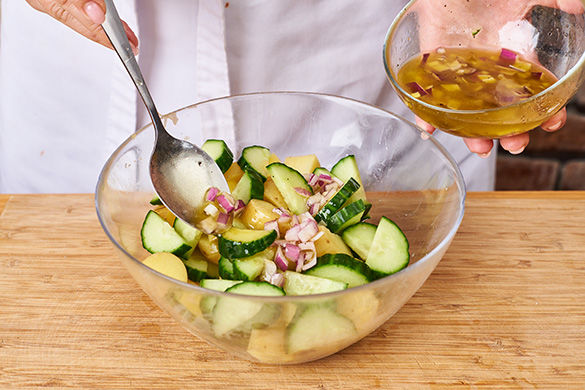 Die Zwiebel, die Chili, den Knoblauch und die Tomaten grob hacken. Die Gurke längs halbieren und in ca. 0,5cm dünne Scheiben schneiden. Die abgekühlten Kartoffeln in mundgerechte Würfel schneiden.