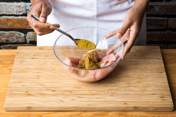 Das Hähnchenbrustfilet mit etwas Küchenkrepp trocken tupfen und in ca. 2cm dicke Medaillons schneiden. Das Fleisch mit 1EL Olivenöl, 1EL Gewürzsalz und etwas Salz vermengen und beiseitestellen.